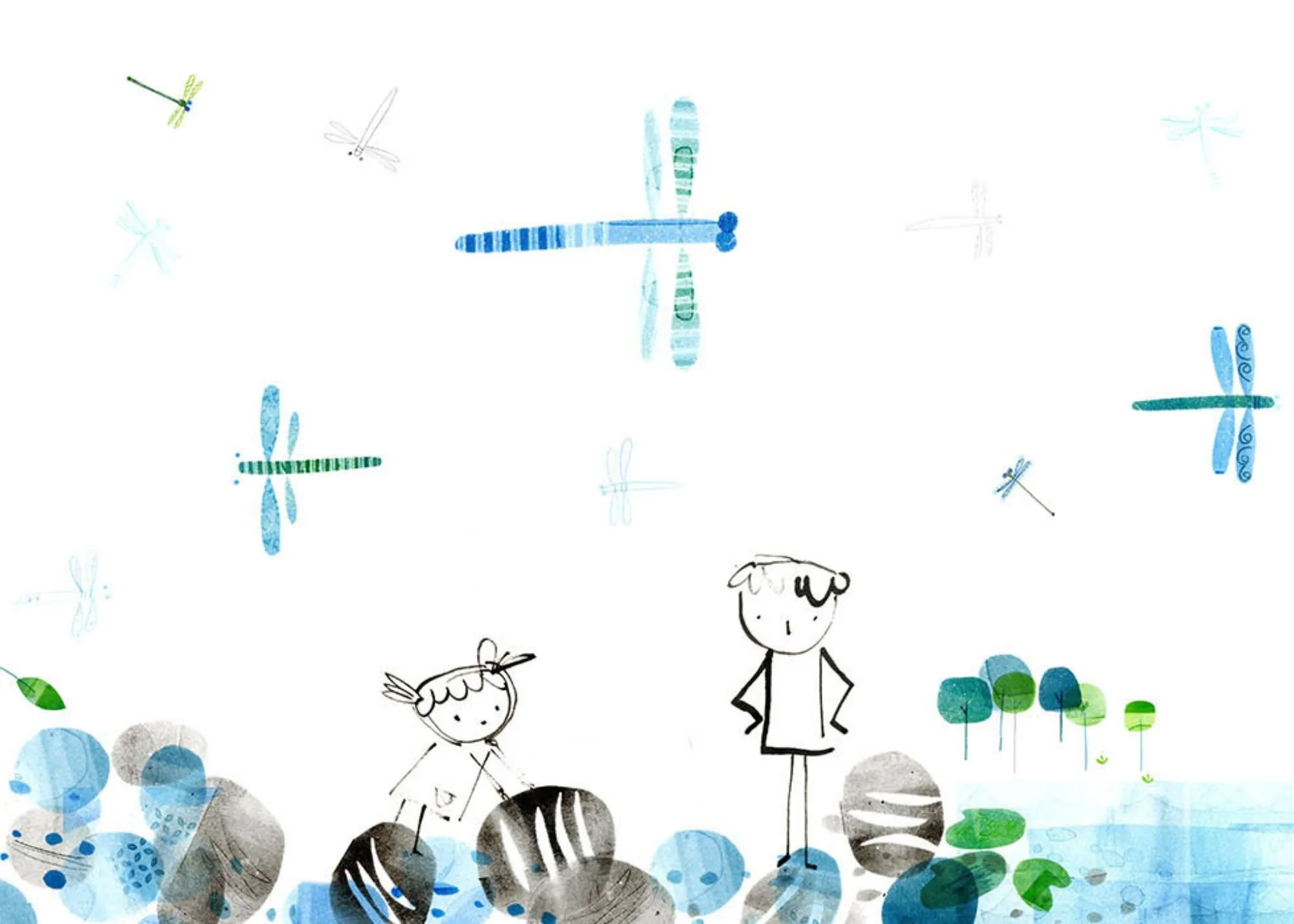 Book 1: Skipping Stones: This is a wordless picture book or Silent Book which invites the reader to follow a young girl and her father on an adventure through the woods to the cool water’s edge. There’s lots to spot and discuss, from dragonflies and exotic birds overhead to turtles and colourful fish in the water. “Delicately coloured illustrations and plenty of space to allow room for sharing a small girl’s experiences while exploring a pond in a wood… A delight on many levels.” -Valerie Coghlan, president of Bookbird, Inc.