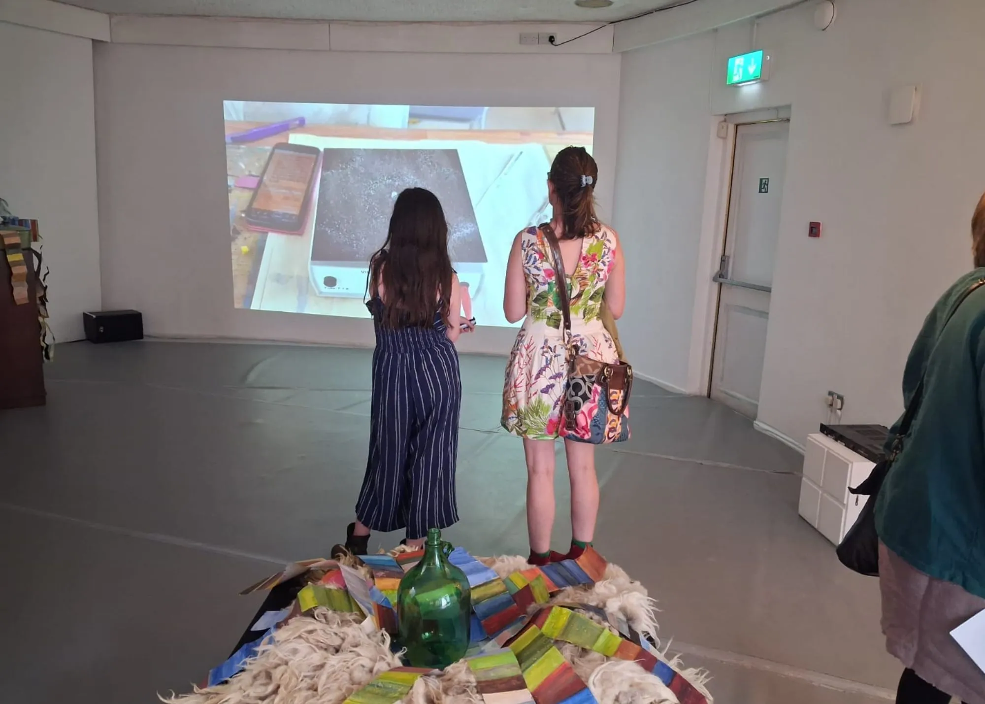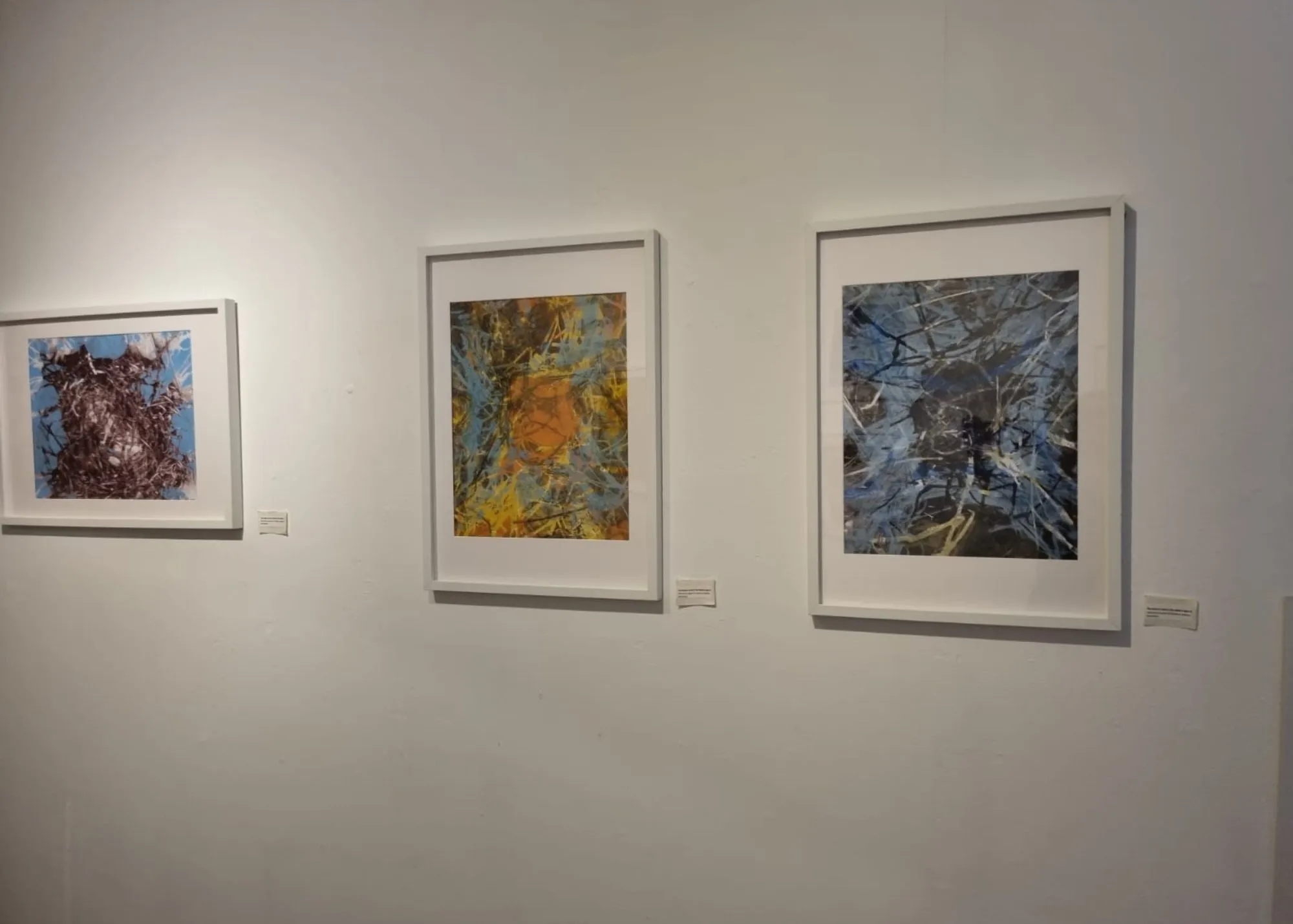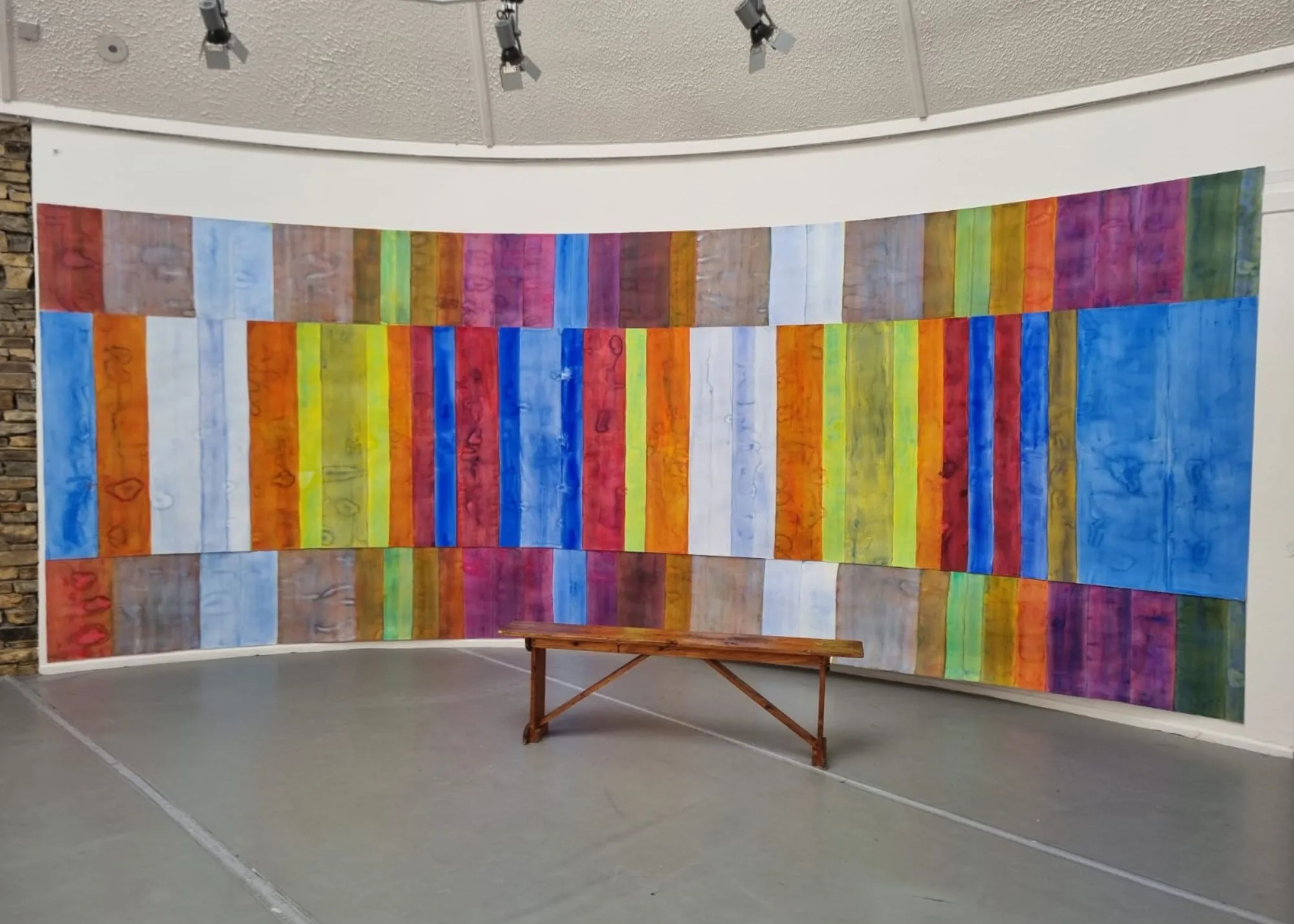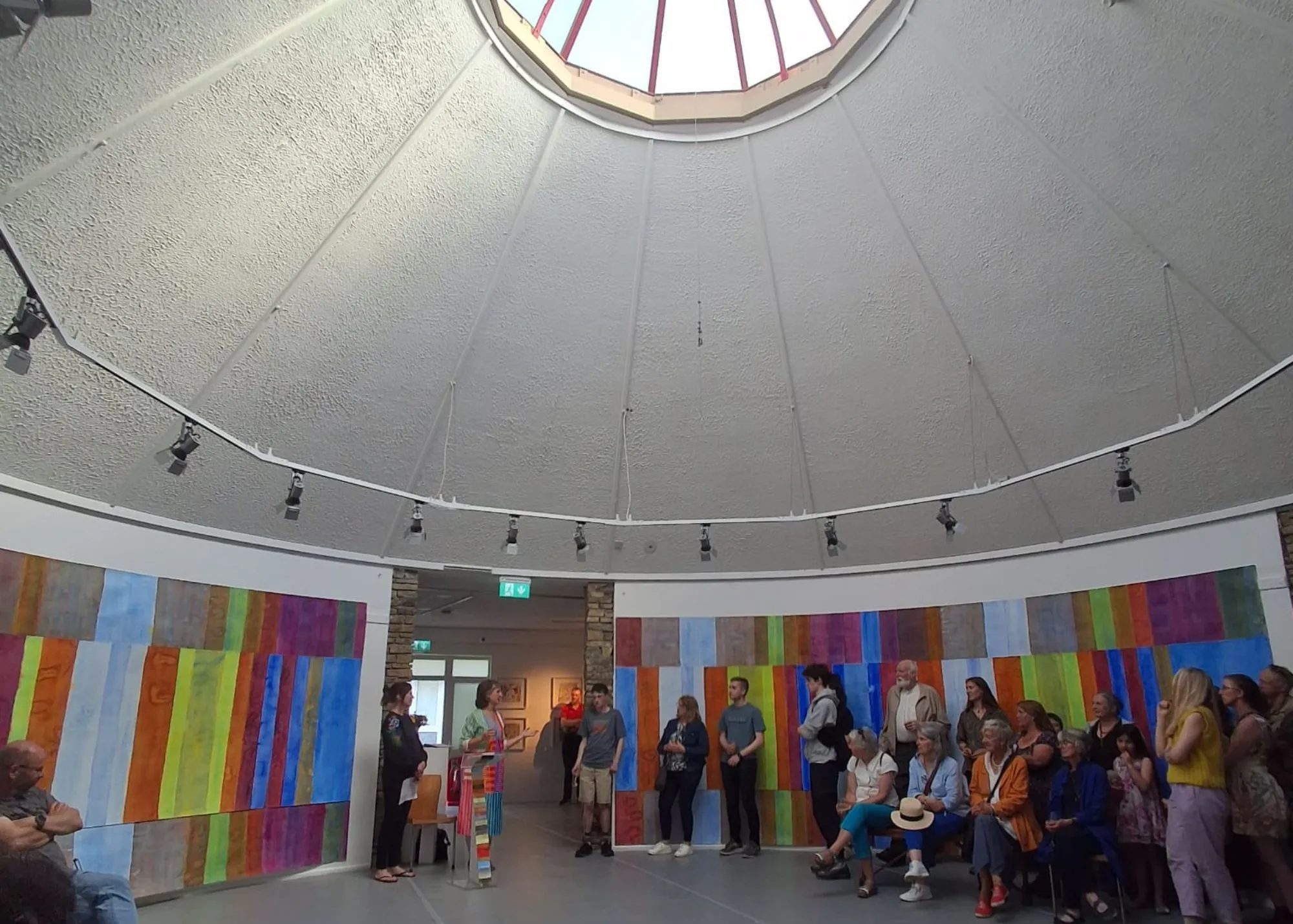 Helen's work was inspired by a tune composed by a Ballydearg, Filemore man named Jerh Coffey, who passed away some years ago. Basing herself around his old cottage at his home place, she began to make paintings of the natural world around her. Using his tune as inspiration, she wondered if she couldn't turn the sound waves into colours and eventually she came up with a notation system using the frequencies or Hertz (Hz) in the music and using corresponding Terrahertz (THz), which is a unit to measure colour. The result is three giant scrolls which abstract both the music and the sense of place.